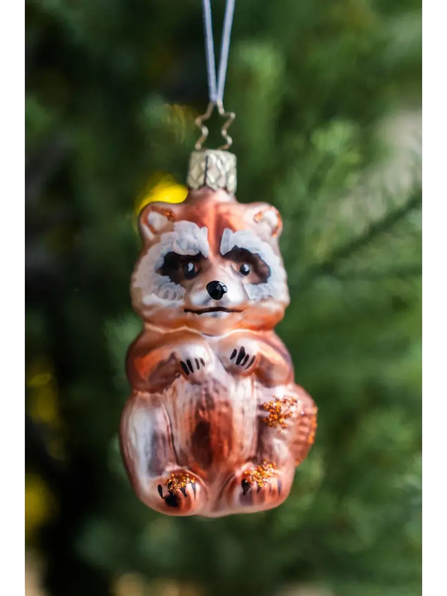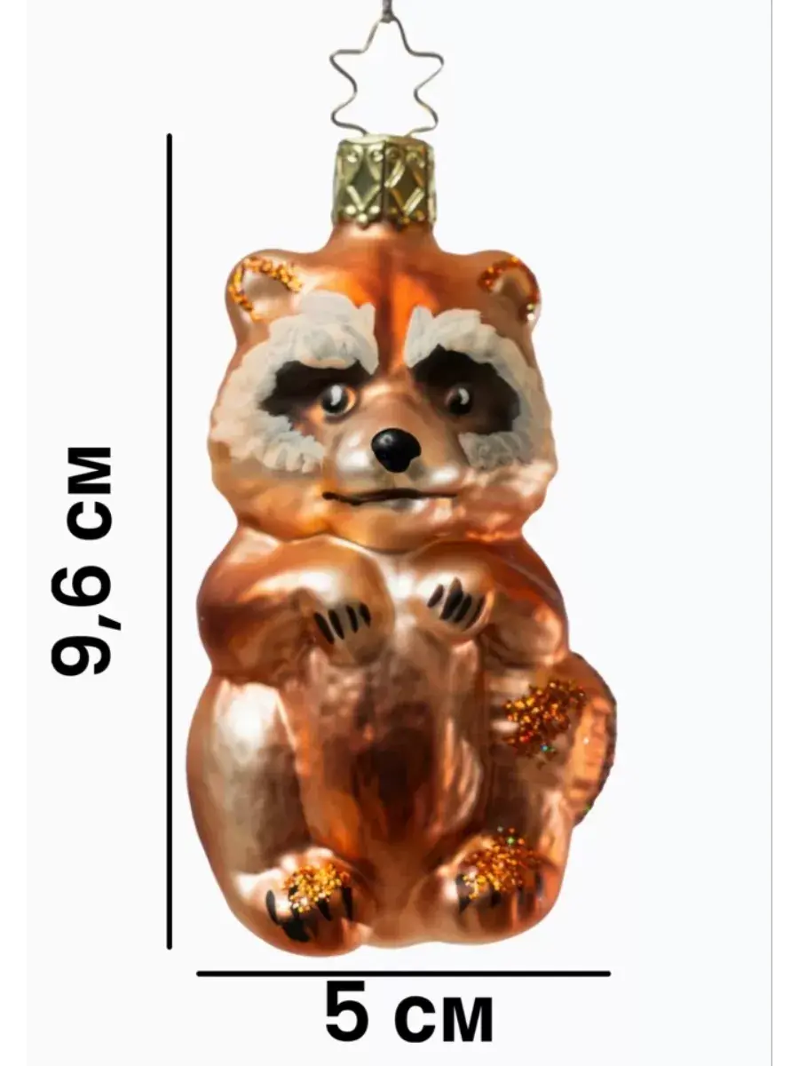 Елочная игрушка в форме енотика из стекла, высота 9,6 см с креплением в форме звездочки. На свету переливаются цвета игрушки светло-коричневый и золотистый, она изготовлена в ручную в лучших традициях стеклодувов, игрушки Inge Glas (Инге Глас). Каждая деталь прорисована с любовью, глазки, мордочка и лапки. Этот очаровательный енотик на вашей елке создаст атмосферу новогодней лесной сказки. Фабрика Германия.